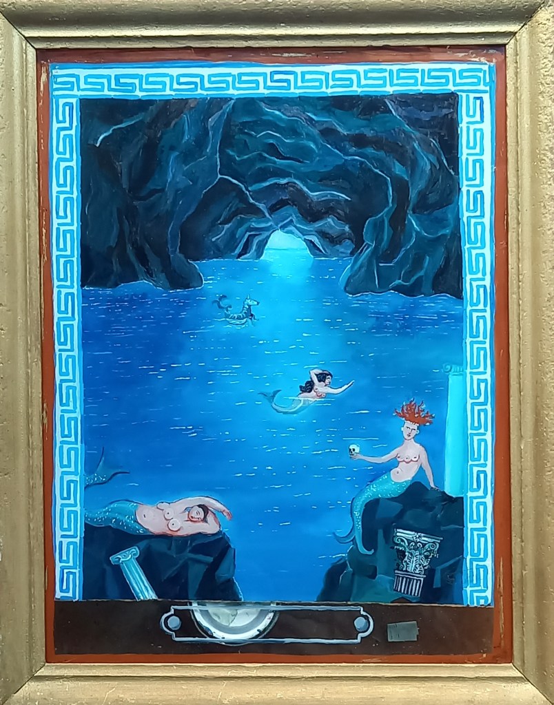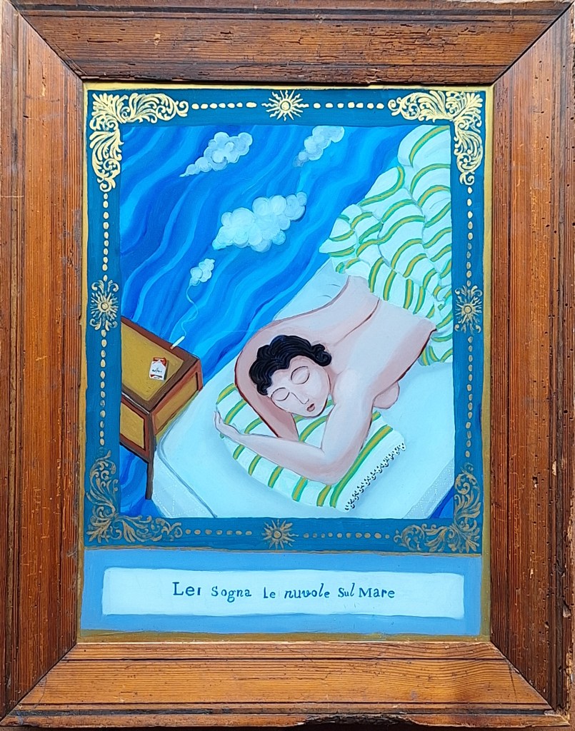 “Roberto di Alicudi – riportando le parole della curatrice – predilige una simbologia allusiva ed ironica, rifacendosi ad uno stile pittorico buffonesco, reinterpretato nel gesto e nel pensiero, con una grazia antica. In ogni sua opera si riconosce la cura, nel dettaglio, nella devozione per il Silenzio, a cui è dedicata un’intera parete delle sale espositive di Villa Lysis, nell’attenzione amorevole alla natura e alle sue creature. La sua è una rilettura originale e poetica del retaggio culturale di un luogo e dei suoi abitanti che restituisce un insieme di opere dall’estetica vivace e dall’anima nostalgica. Nostalgica come la tecnica minuziosa su vetro con cui realizza tutte le opere ispirandosi all’arte dei Pincisanti radicata nei borghi remoti e nelle piccole isole della Sicilia.”