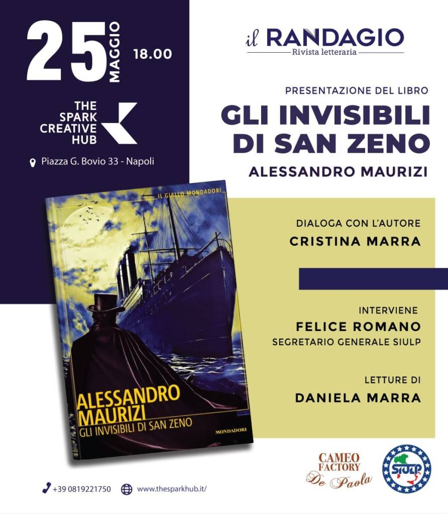 La libreria The Spark Creative Hub di Napoli ospiterà – SABATO 25 MAGGIO ALLE 18.00 – la presentazione del romanzo giallo storico “Gli Invisibili di San Zeno” di Alessandro Maurizi, edito da Mondadori. L’incontro sarà introdotto e moderato da Cristina Marra con letture a cura di Daniela Marra e l’intervento di Felice Romano, segretario generale del SIULP – Sindacato Italiano Unitario Lavoratori Polizia.