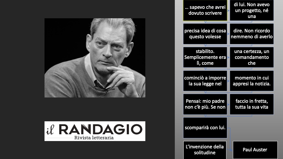 La morte del padre è per Paul Auster una causa scatenante per confrontarsi con se stesso, con il proprio passato e futuro. Uno sprone per cercare attivamente le risposte alle domande che la vita ci pone continuamente e provando, quindi, a non essere travolti dal caso.