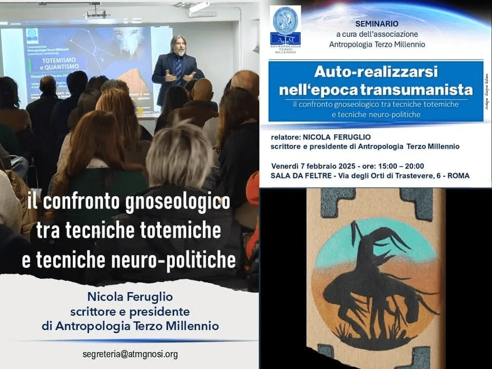Nicola Feruglio , scrittore e presidente di Antropologia Terzo Millennio, Venerdì 7 febbraio 2025 (dalle ore 15:00 alle ore 20:00), presso il Conference Center Ecomap di Roma (Sala da Feltre) in Via degli Orti di Trastevere numero 6, realizzerà il Seminario aperto al pubblico dal titolo: “AUTO-REALIZZARSI NELL’EPOCA TRANSUMANISTA” – Il confronto gnoseologico tra tecniche totemiche e tecniche neuro-politiche.