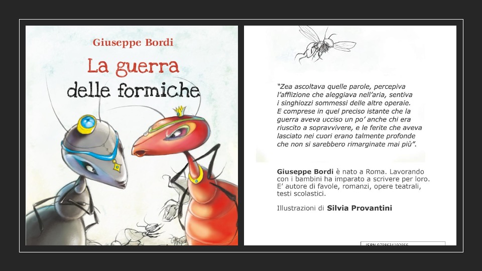Margherita: Grazie delle preziose informazioni. Prima di salutarci, oggi il nostro consiglio di lettura torna in grande stile: “La guerra delle formiche” scritto da Giuseppe Bordi e illustrato da Silvia Provantini (Lupo blu editore).
