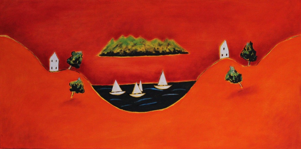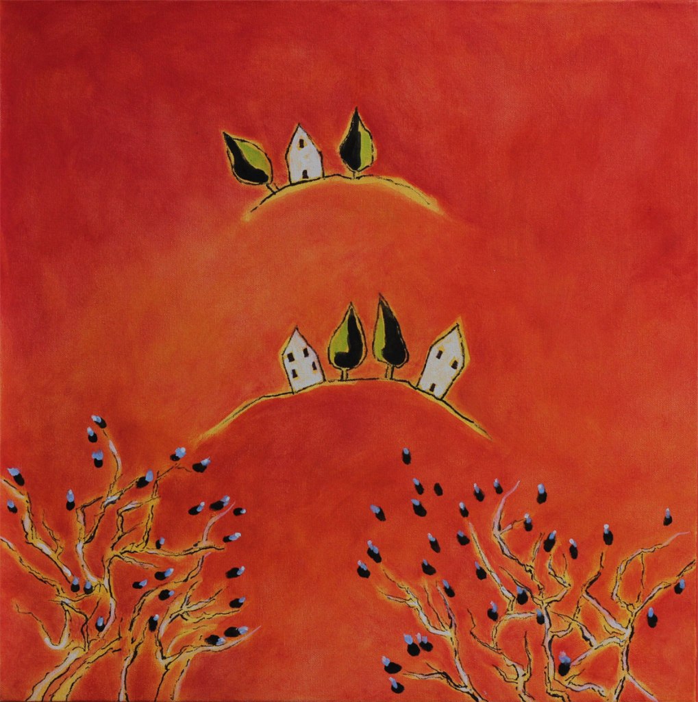 Il motivo caratterizzante delle opere in mostra è il paesaggio su sfondo rosso, che testimonia la sensibilità dell’artista verso il surriscaldamento globale del pianeta ed i preoccupanti e sempre più accelerati cambiamenti climatici.