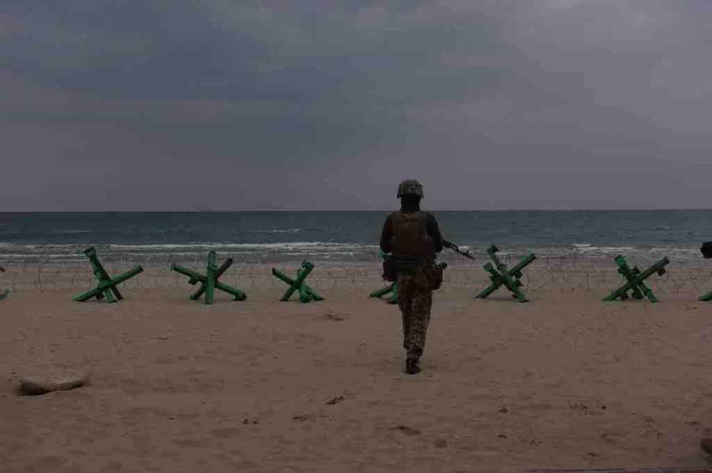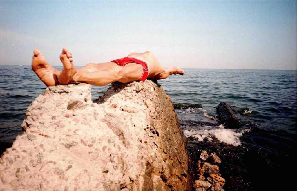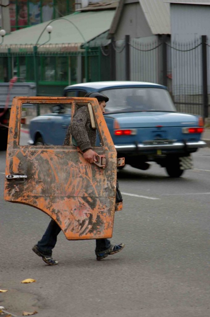 David Grigoryan A man laying on a pier rock, Odessa 2018. Serie “Odessa Sole mio”, courtesy zanzara arte contemporanea. – Siamo sul molo di Odessa, un uomo disteso sembra in perfetto equilibrio sul mare, sorretto tra gli spuntoni di uno scoglio. David scambia qualche parola con lui e resta sorpreso per l’odio che l’uomo manifesta verso il regime comunista, perché – racconta David – la maggior parte degli uomini di mezza età rimpiangono l’unione sovietica. Poi per ricordarsi di quel momento, scatta questa immagine.David Grigoryan A man carrying a door to sell it in the recycling center, Odessa 2010. Serie “Odessa Sole mio”, courtesy zanzara arte contemporanea. – Continuiamo a percorrere con David le strade di Odessa e incontriamo un uomo che porta un vecchio sportello in officina, mentre sullo sfondo passa un’auto sovietica. Sono trascorsi circa 12 anni da quello scatto.David Grigoryan A soldier guarding the coastline mined and blocked by wire and Czech hedgehogs, Odessa 2022. Serie “Odessa Sole mio”, courtesy zanzara arte contemporanea. – Cavalli di Frisia e filo spinato occupano la spiaggia che prima era aperta ai bagnanti, si vede un soldato che scruta l’orizzonte dalla spiaggia, che ora è off limit per la popolazione.