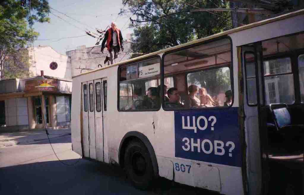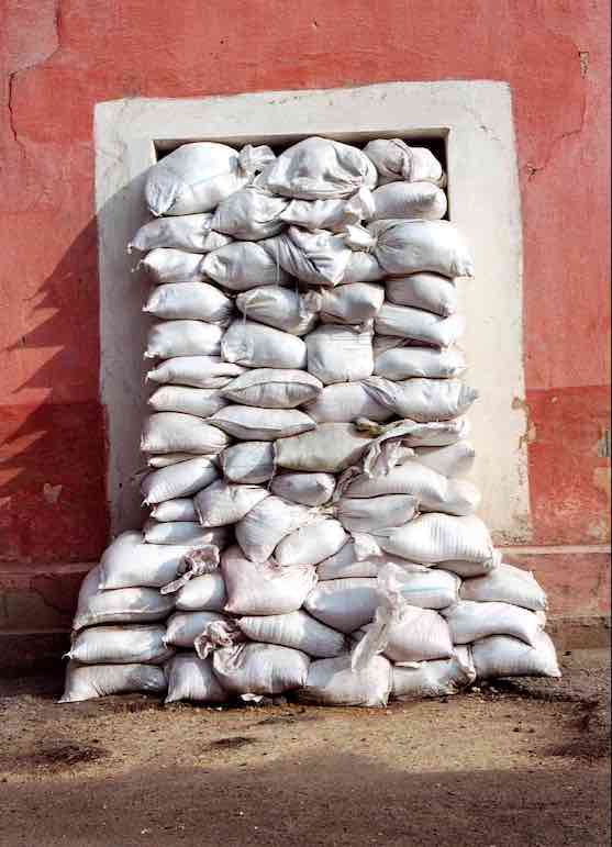 David Grigoryan “What? Again?” The driver is fixing the trolleybus, Odessa 2018. Serie “Odessa Sole mio”, courtesy zanzara arte contemporanea. – Cosa? Di nuovo? L’autista sistema le aste cadute del filobus che devono essere collegate ai cavi elettrici. Da questa descrizione, possiamo intuire che non si è trattato di un evento raro e la foto, scattata nel 2018, mostra un uomo che cammina sul tetto di un filobus. Il costo del biglietto? 30 centesimi, con eventuale performance inclusa.David Grigoryan An entrance of a surgery barricaded by sandbags, Odessa 2022. Serie “Odessa Sole mio”, courtesy zanzara arte contemporanea – Da quelle stesse spiagge, dallo scoppio della guerra, la popolazione ha raccolto grandissime quantità di sabbia per riempire i sacchi che circondano i monumenti, gli ingressi alla città e luoghi strategici.