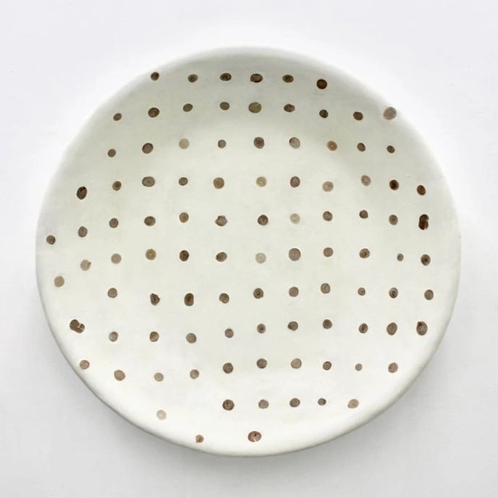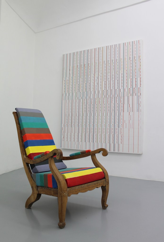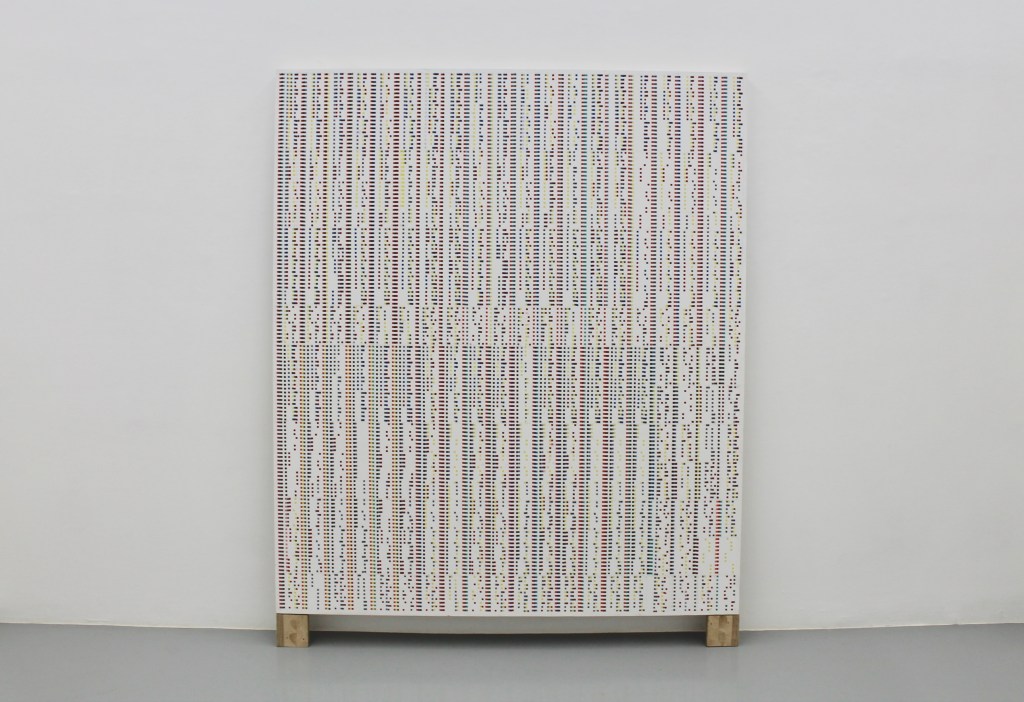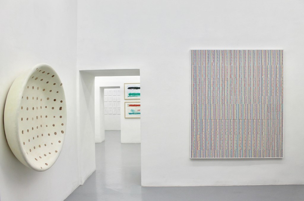 Materie prime sono l’impianto numerico delle opere combinatorie dei “quadratini colorati”, la cera ei pigmenti che compongono la materia colorata dei dipinti. Materia prima, nella serie di disegni di “database”, è il lento divenire di elementi dell’ambiente in cui è situato lo studio con il quale l’artista si confronta: il meleto annesso al suo studio masseria. Questo moto oscillatorio, paragonato dall’artista a una sorta di respiro, è evidente già dalla prima sala in cui sono esposti: un quadro combinatorio del 2023 della nuova serie dei “quadratini colorati” (“quadro B”) e “scodella” un’opera del 2013 della serie “cerimoniale”, dove nel concavo della forma in cera bianca sono incastonate in ritmo regolare sottili sezioni di rami di melo, ricavate dalla potatura del meleto.