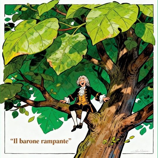 La trama del “Barone rampante” è a tutti nota: un ragazzino di dodici anni, sul finire del ‘700, in una località della Liguria che non esiste, di nome Ombrosa, rampollo di una famiglia aristocratica e di nome Cosimo Piovasco di Rondò, un giorno rifiuta di mangiare una disgustosa zuppa di lumache. Il barone, suo padre, gli ordina di farlo ma lui esce in giardino e si arrampica su un albero. Chi, cinquant’anni fa, non ha rifiutato di mangiare un cibo che non gli piaceva? E chi non ha avuto un padre che si è imposto di farsi ubbidire, pena, per lui, la perdita di ogni autorità? Nessuno, cinquanta e passa anni fa. C’era chi si piegava e chi no, nessuno che, dopo essersi arrampicato su un albero, non ne sia mai più disceso. Cosimo lo fa: promette di non scendere mai più e non scenderà mai più.