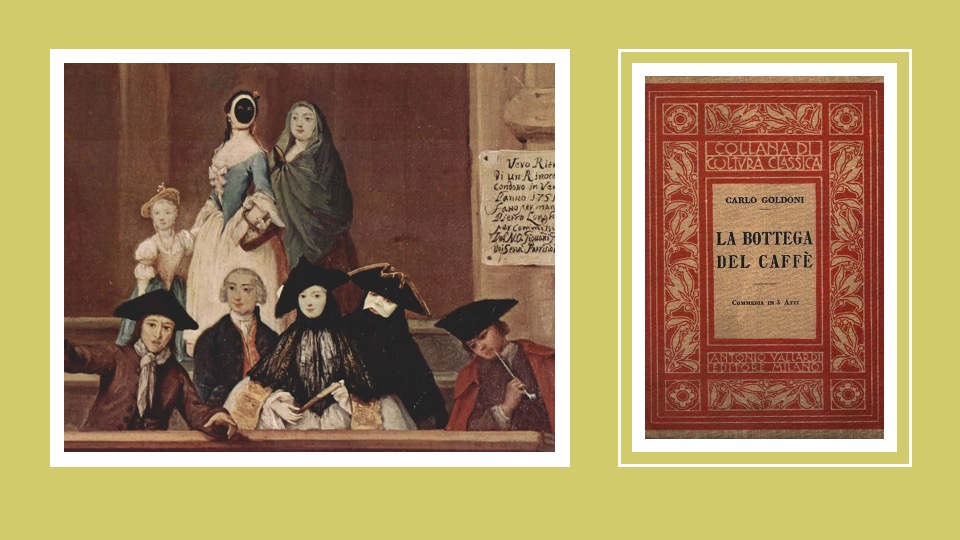 La bottega del caffè, deliziosa commedia in prosa scritta in tre atti, viene rappresentata per la prima volta a Mantova nella primavera del 1750, in seguito a Milano e, nell’autunno e successivo carnevale, a Venezia. Ce ne parla lo stesso Goldoni nelle Mémories, inestimabile fonte di notizie circa le sue opere. Si prende qui in considerazione l’edizione dei Classici BUR Rizzoli, con l’introduzione di Luigi Lunari e la premessa al testo e note di Carlo Pedretti.